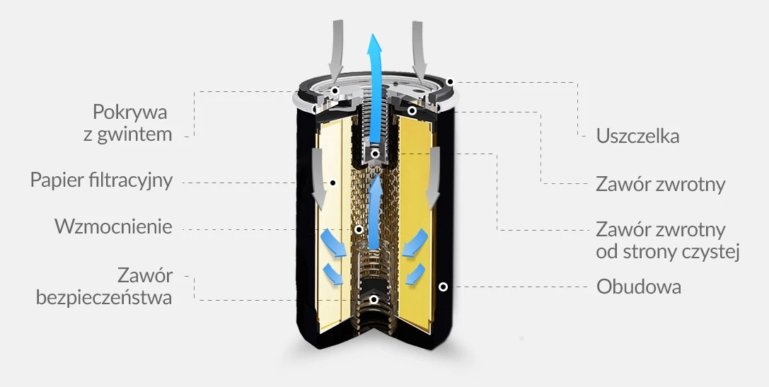 - zawór zwrotny, skutecznie zabezpieczający przed spływaniem środka smarującego silnik w stronę pompy (od strony czystej zawór zapobiega powstawaniu zjawiska „suchego startu”)